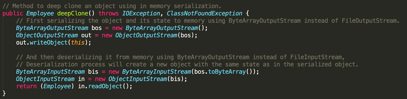 And as discussed in 5 different ways to create objects in java, deserialising a serialised object creates a new object with the same state as in the serialized object. So similar to above cloning approaches we can achieve deep cloning functionality using object serialization and deserialization as well and with this approach we do not have worry about or write code for deep cloning, we get it by default.