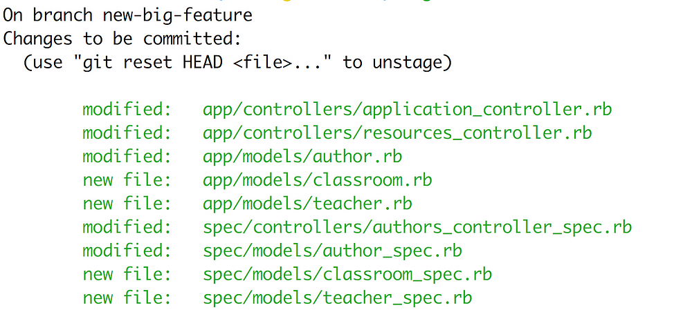 I had been working on a big, new feature, a tricky problem. After a few hours of solidly working away, I was done. I ran git status and sat back and looked proudly at the list of red that detailed the ten or so files that I had either modified or created.