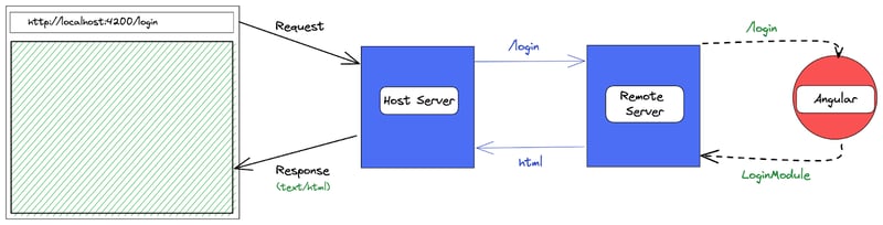 Angular Universal will switch to CSR after the initial page load, which means if we were to click on the login link, it would use CSR to render that page. The Angular Module that is resolved and rendered still lives on the remote server, but Module Federation will still resolve this correctly! 🔥