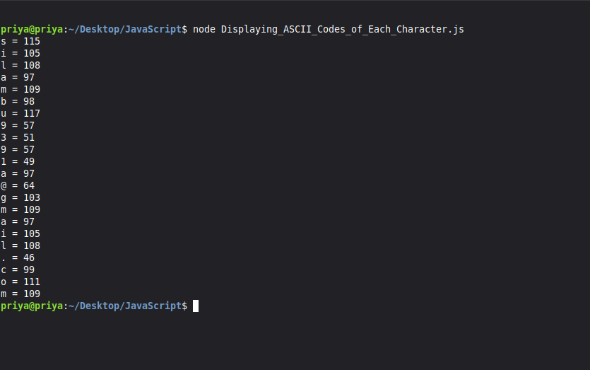 console.log(name[index]+ " = " + name.charCodeAt(index));