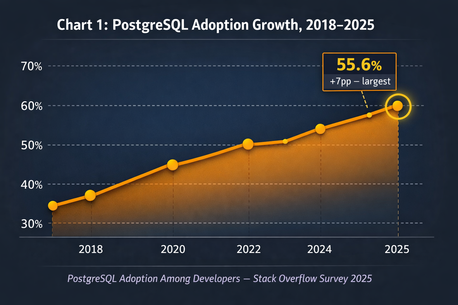 - 55.6% of developers already use PostgreSQL (Source: Stack Overflow Developer Survey, 2025) — you probably already have it in your stack