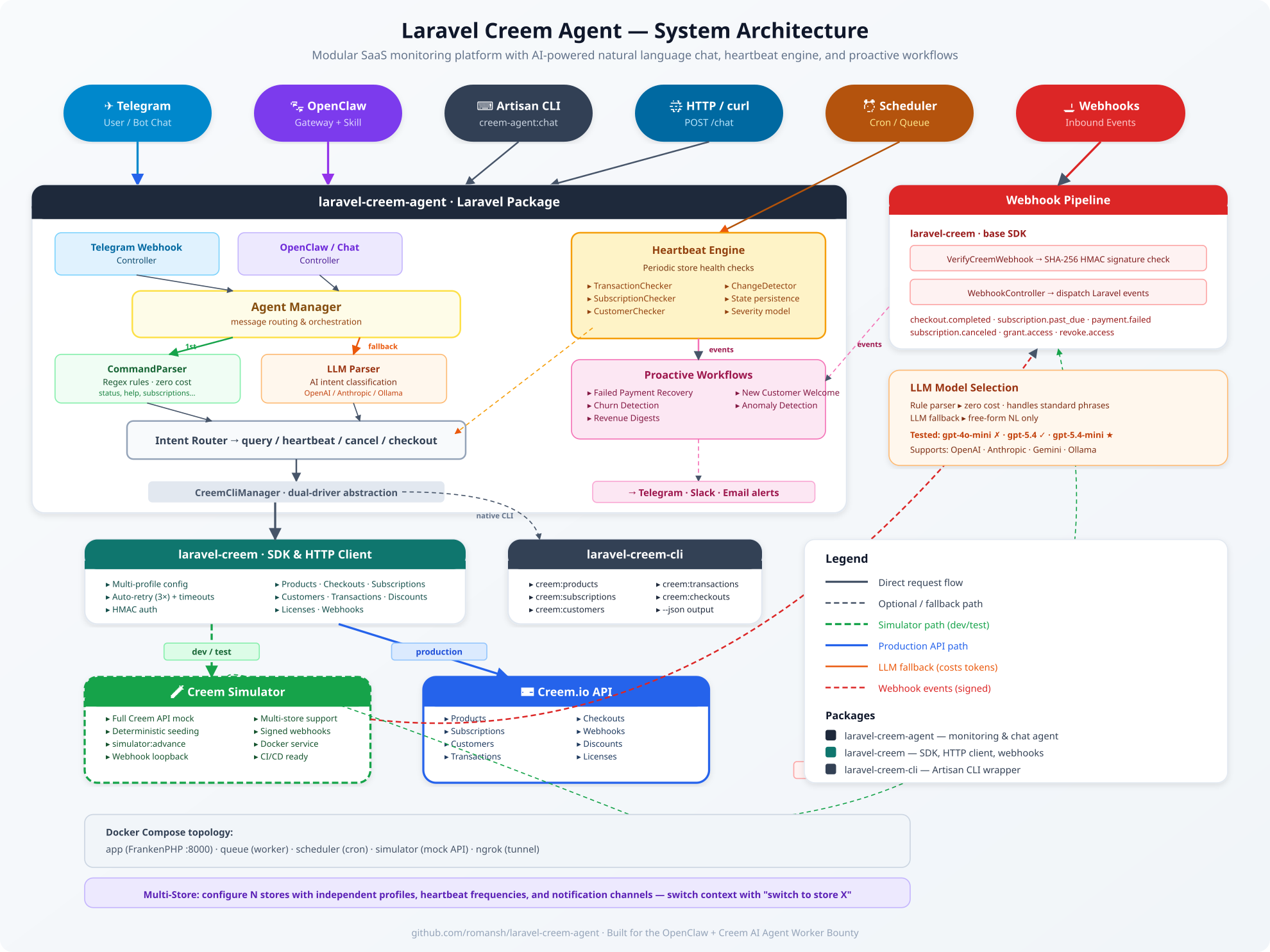Every package is a standalone Composer library. You can use laravel-creem without the agent and the CLI without OpenClaw. But when they're combined, you get something powerful.