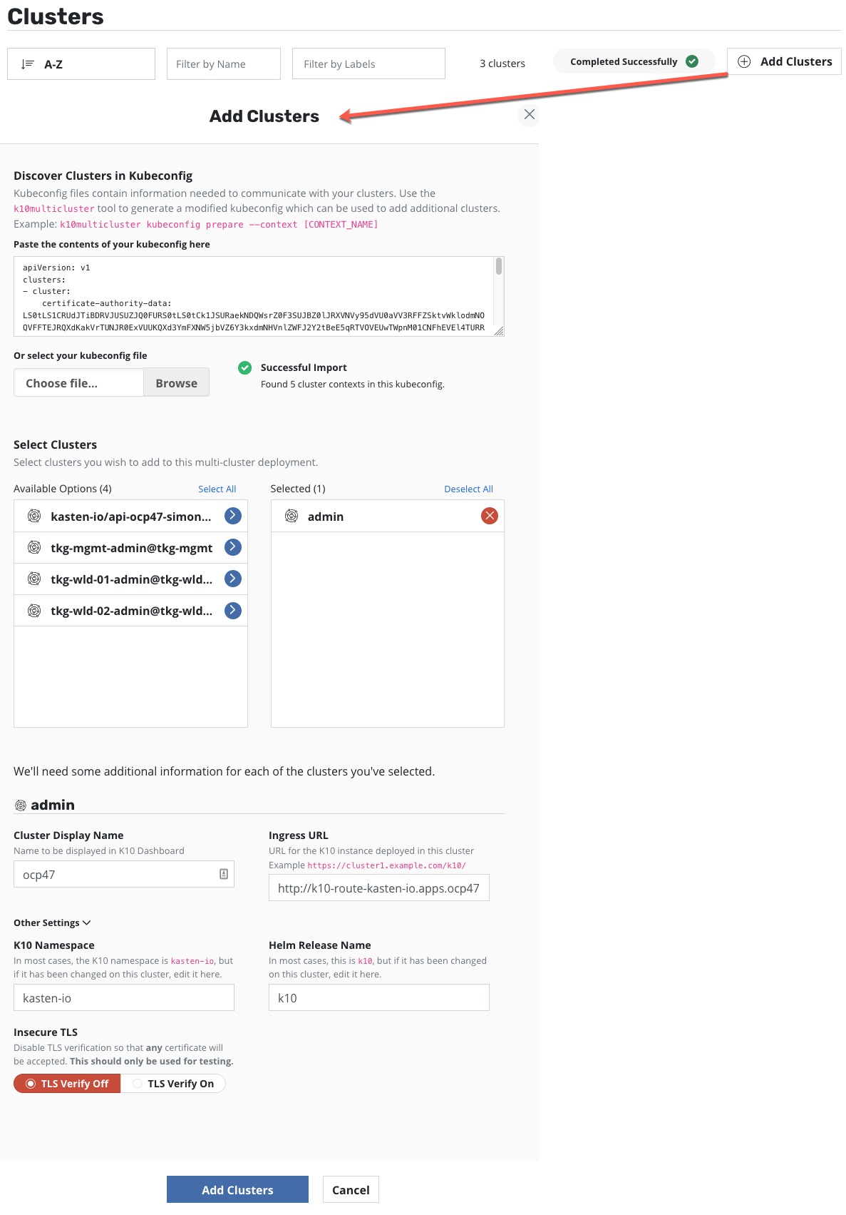 You can also add clusters in directly in the UI by uploading your kubeconfig file.