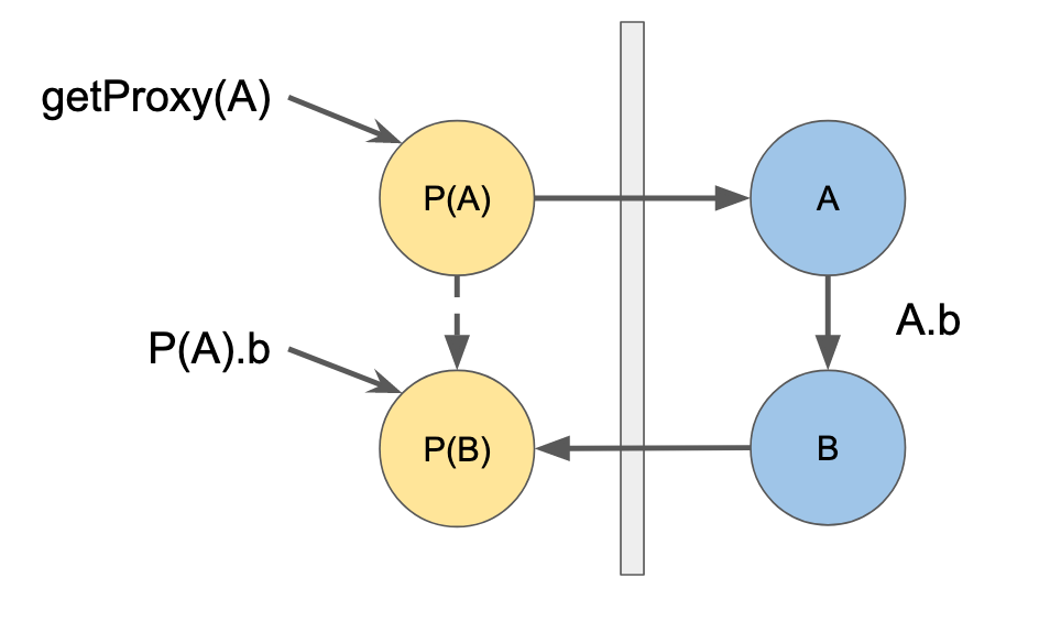 If A has a property b of type B, then A.b returns a object of type B. But P(A).b returns P(B). The membrane hooked the access to the property b and distorted the result to return a proxy object for b. This is obviously transparent to the consumer: