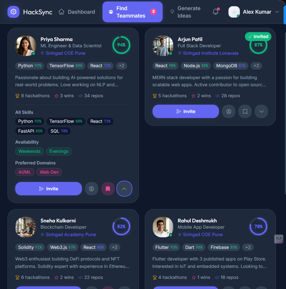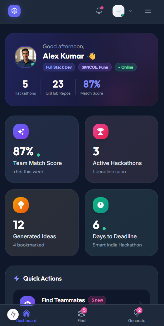 "Samarth's app found me React+FastAPI+Deployment teammates in 47 seconds. We won 2nd place!"