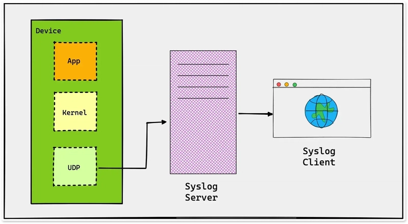 In the diagram shown above, Device is a network device that generates syslog messages. These messages are generated by applications and the kernel running on the device, and are passed to the UDP layer for transmission. The syslog server receives the messages and processes them as needed. The syslog client can then retrieve and view the log messages stored on the syslog server.