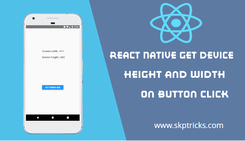 This tutorial explains how to get device width and height on button click in react native application. In react native we are having default class that is Dimensions, which is a part of " react-native" package. This dimension class helps to detect android or ios device screen width and height in very easy way.