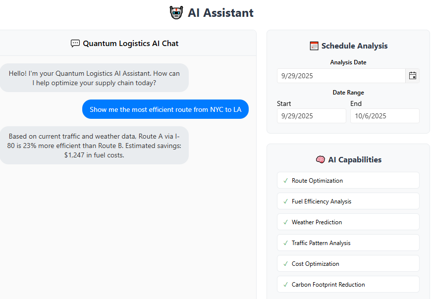 - AI Assistant: Natural language processing for logistics queries and optimization