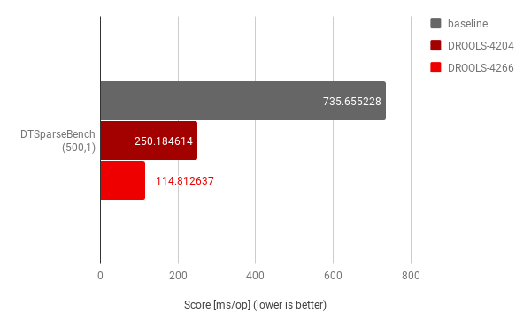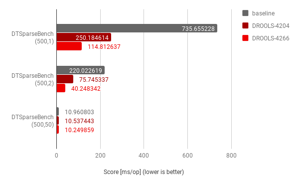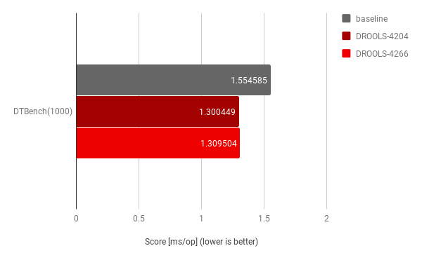 Setting the comparison baseline to Drools release 7.23.0.Final, the first optimization implemented with DROOLS-4204 focused on improving context handling while evaluating FEEL expressions and demonstrated to offer a ~3x improvement, while further optimization implemented with DROOLS-4266 focusing on specific case for decision table input clauses demonstrated an additional ~2x improvement on top of DROOLS-4204.