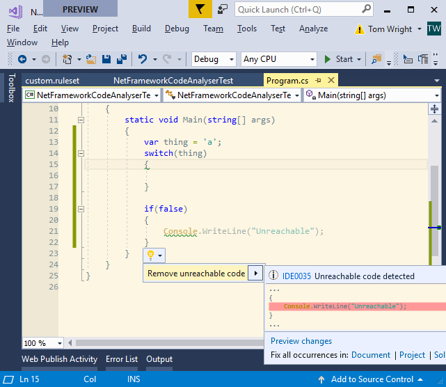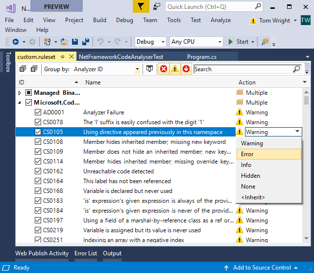 OK, so we’re all on the same page, let’s recap the functionality that Visual Studio offers when it comes to code analysers.