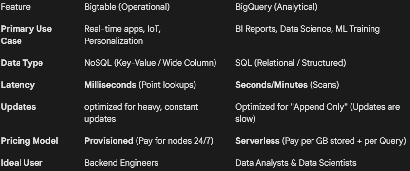 The difference isn't just technical; it's fundamental to how data is used. Google Bigtable is for doing business (Operational). Google BigQuery is for analyzing business (Analytical).