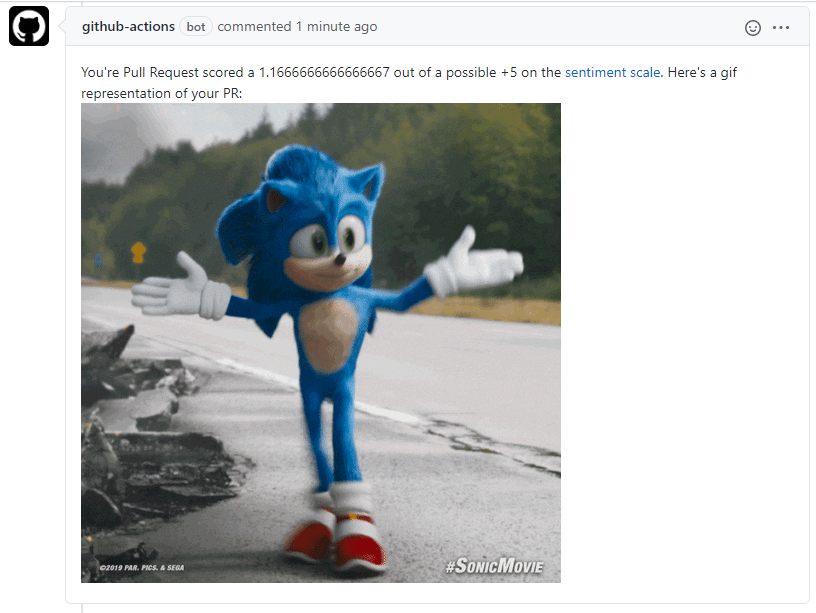 This action uses sentiment to analyze the sentiment of an incoming PR and responds with a gif and score from -5 to 5.