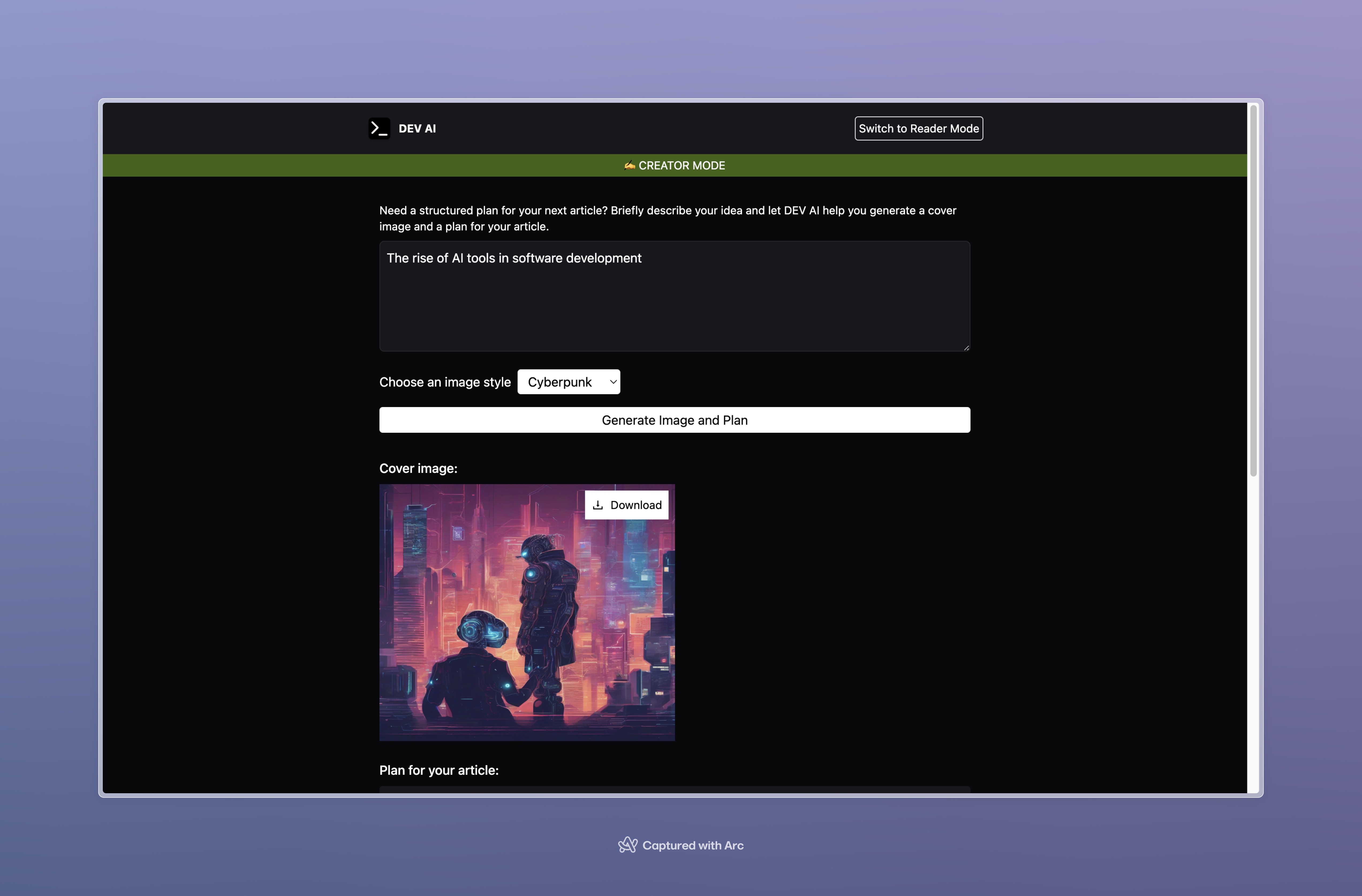 Presenting DEV AI ✨, an AI assistant for the DEV platform. The app caters to two categories of users: Readers and Creators.