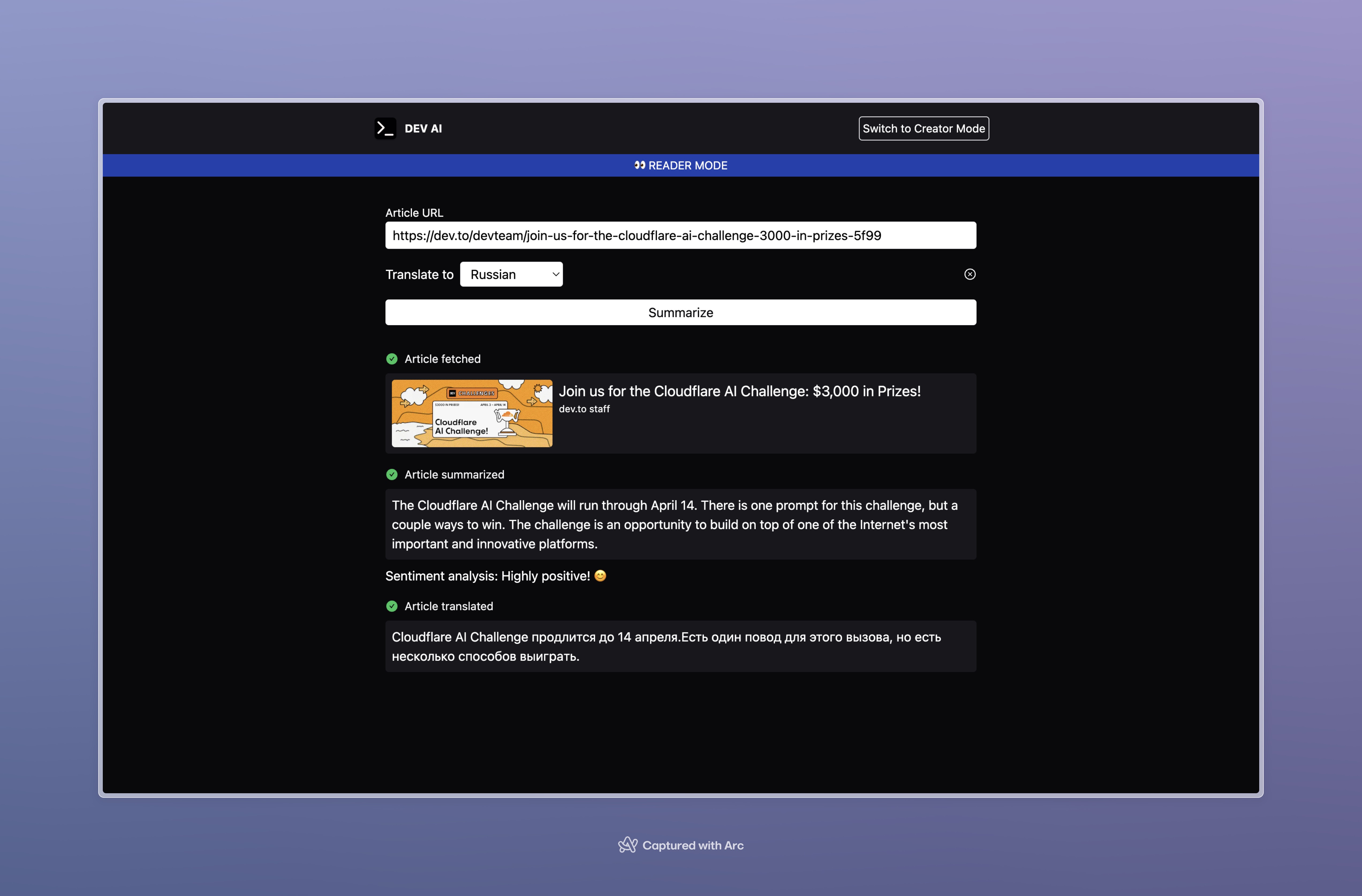 Then while browsing DEV, I got this idea of summarizing articles instead. I know it's been built too, but not specifically for DEV. I added translation and sentiment analysis as well to take it a step further.