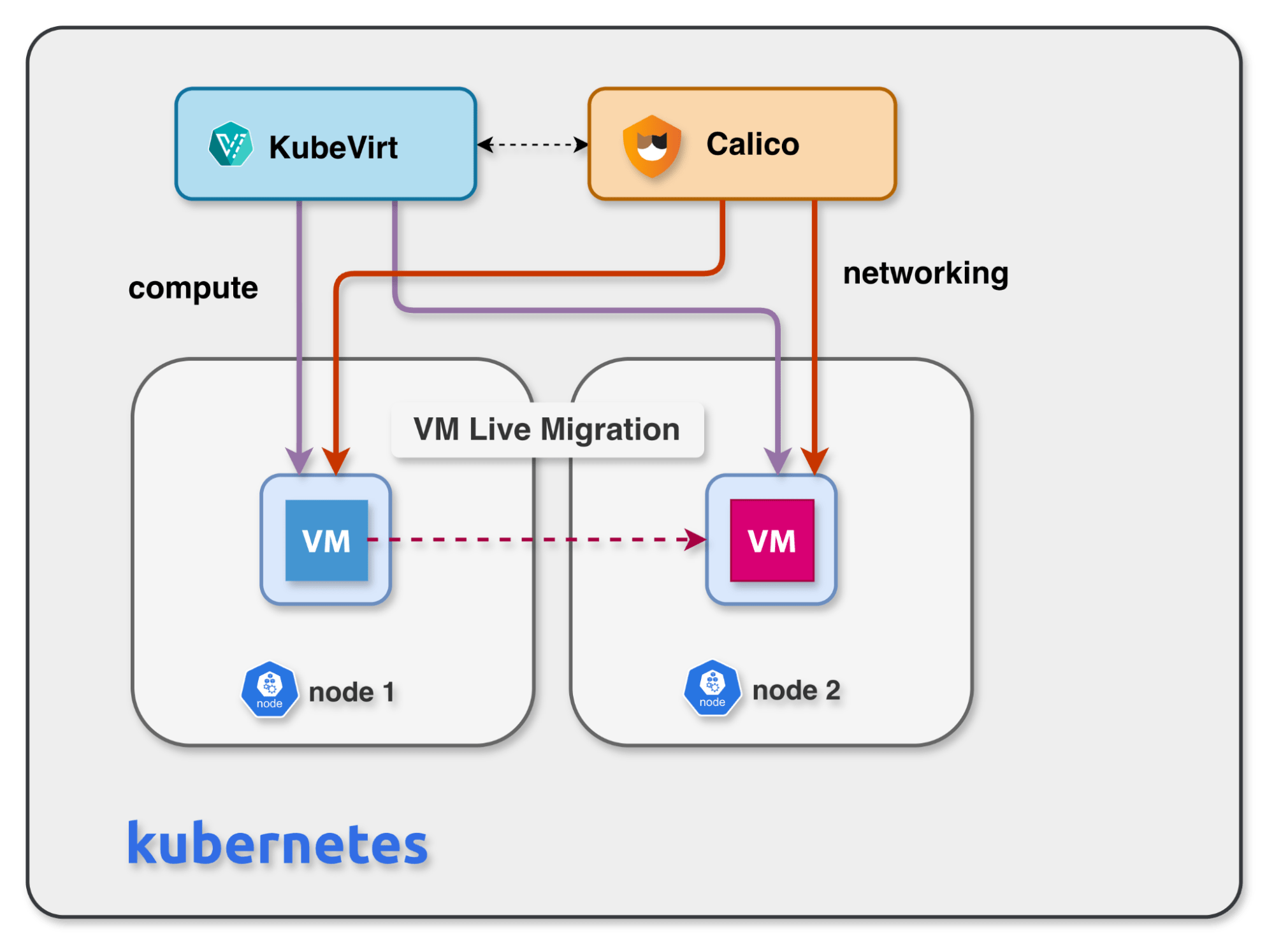 The key point is that the VM does not need a brand new networking model just because it moved to Kubernetes. The same layer 2 network structure can be preserved, which makes lift-and-shift migration much more practical.