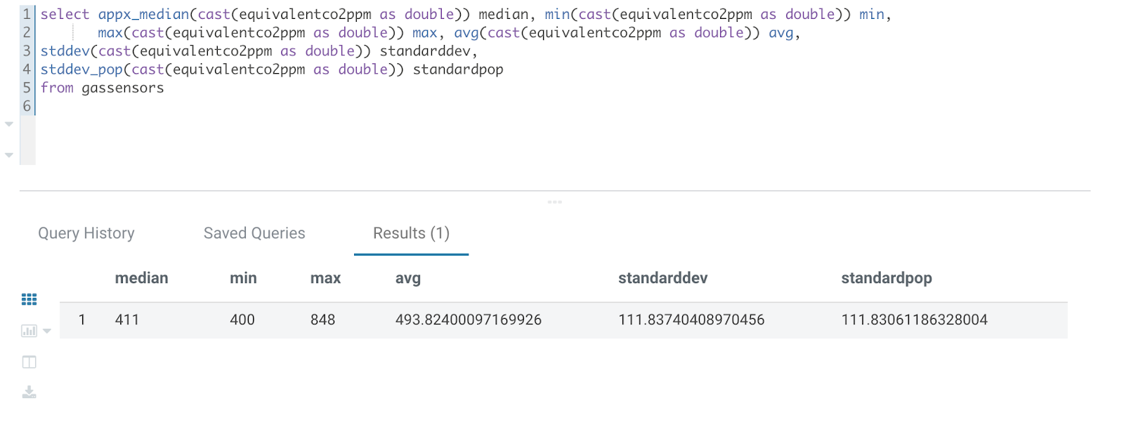 *select appx_median(cast(equivalentco2ppm as double)) median, min(cast(equivalentco2ppm as double)) min, *