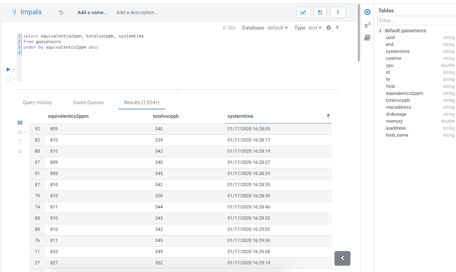 **cast(totalvocppb as double) as TVOC, cast(equivalentco2ppm as double) CO2PPM