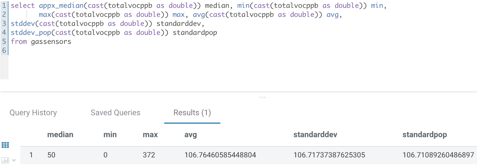 *select appx_median(cast(totalvocppb as double)) median, min(cast(totalvocppb as double)) min, *