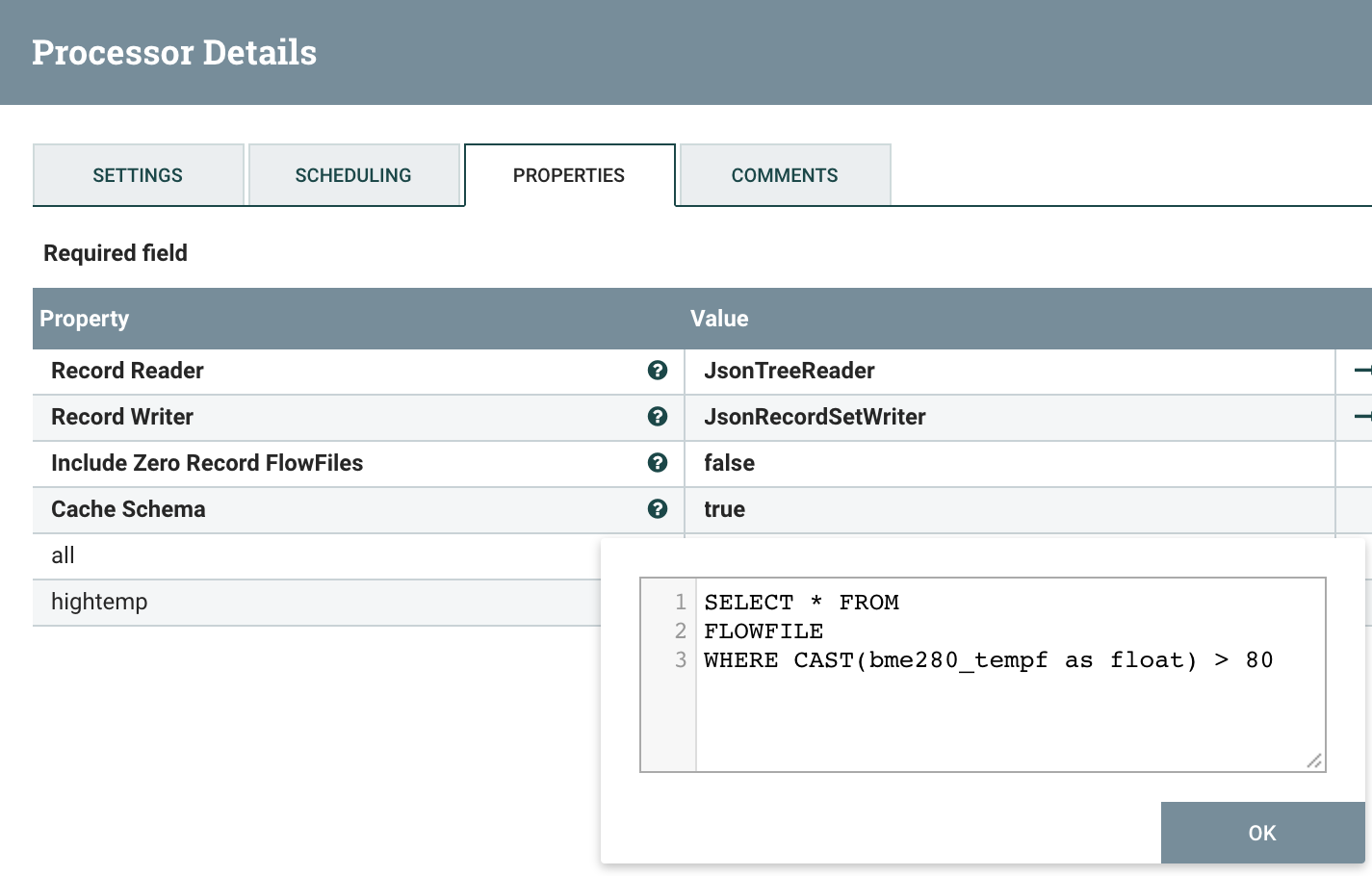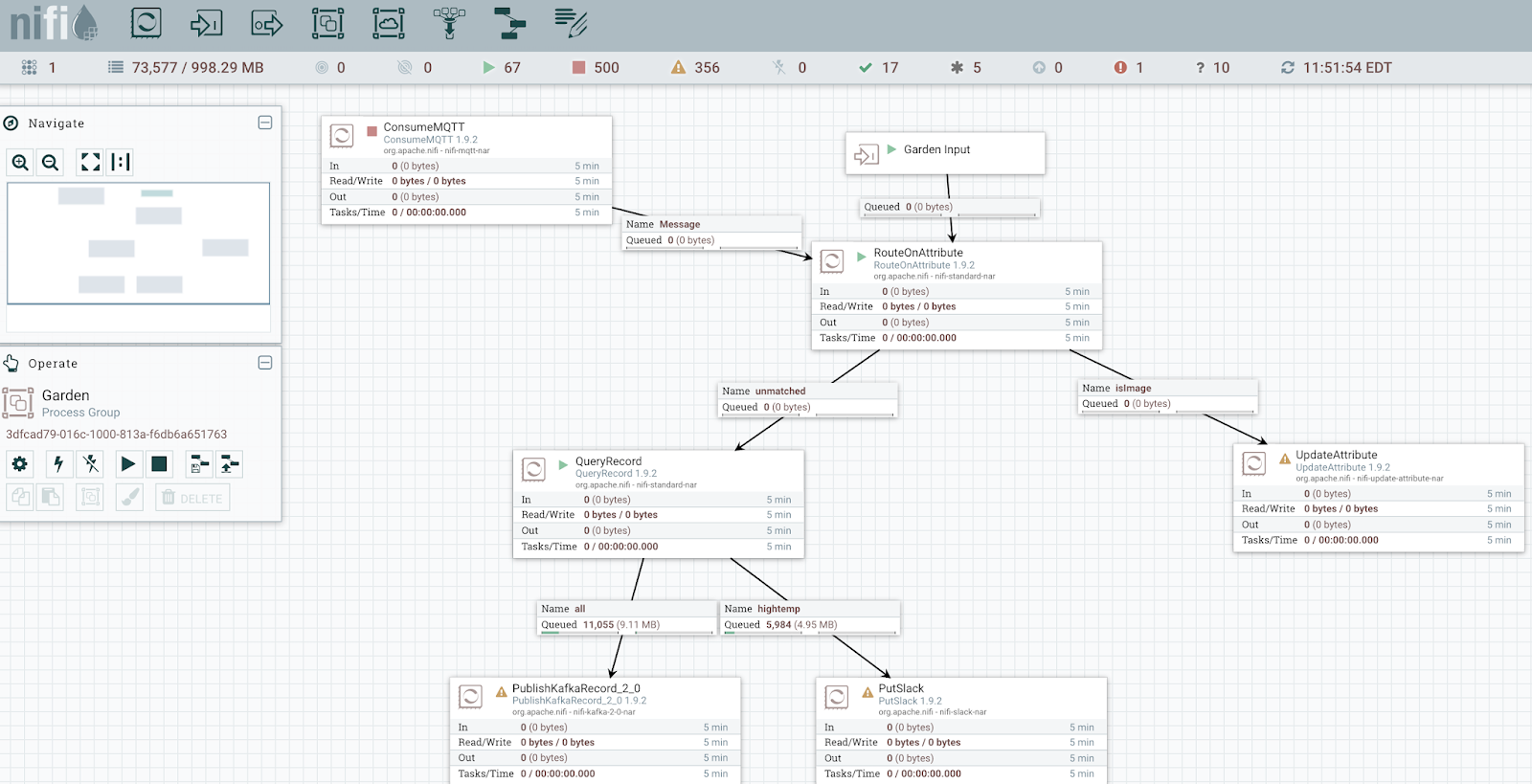 The Python script initializes the connections to all of the sensors and then goes into an infinite loop of reading those values and building a JSON packet that we send via MQTT over port 1883 to a MQTT Mosquitto broker. MiniFi 0.6.0 Java Agent is using ConsumeMQTT on that port to capture these messages and filter them based on alarm values. If outside of the checked parameters we send them via S2S/HTTP(s) to an Apache NiFi server.