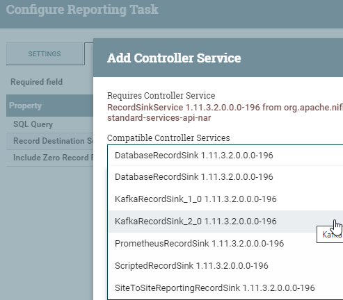 We add one per item we want to monitor. Then for the reporting task we will need a place to send the records (a sink), we can send it to a JDBC Database ( DatabaseRecordSink, KafkaRecordSink, PrometheusRecordSink, ScriptedRecordSink or SiteToSiteReportingRecordSink ). ** ** I am going to do Kafka, but Prometheus, Database and S2S are good options. If you send SiteToSite you can send to another NiFi cluster for processing for that NiFinception processing route,
