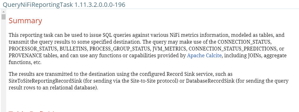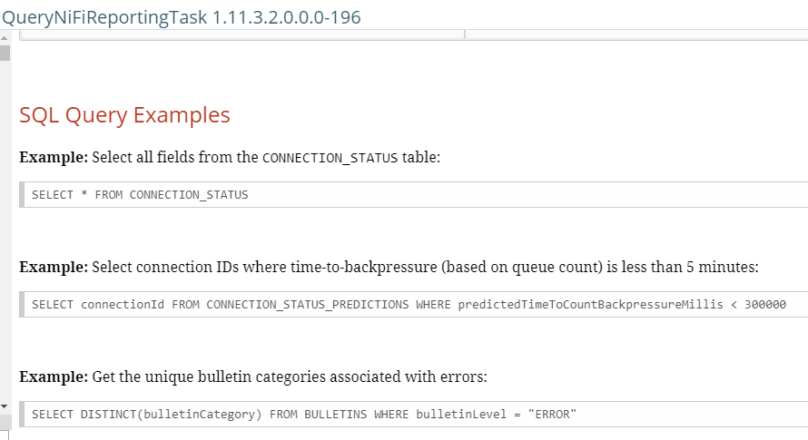 SQL reporting task. The QueryNiFiReportingTask allows users to execute SQL queries against tables containing information on Connection Status, Processor Status, Bulletins, Process Group Status, JVM Metrics, Provenance and Connection Status Predictions. In combination with Site to Site, it is particularly useful to define fine-grained monitoring capabilities on top of the running workflows.