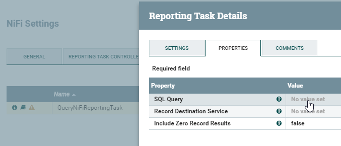 So let's go to Controller Settings / Reporting Tasks and then add QueryNiFiReportingTask :