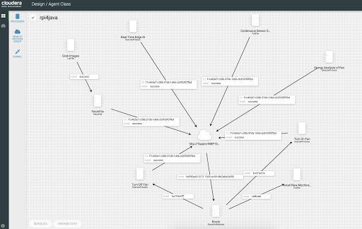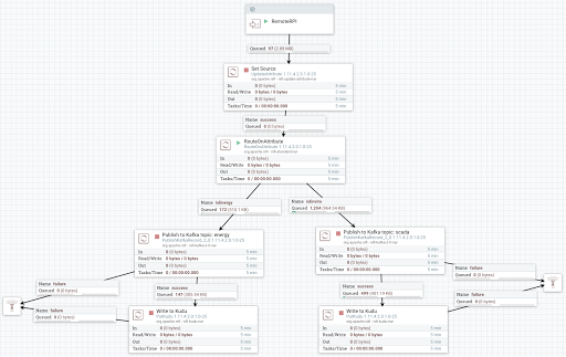 MiNiFi sends the data it reads from sensors and a camera and sends them to a local NiFi gateway. That NiFi gateway sends a stream to my CDP hosted CFM NiFi cluster for processing. This cluster splits the data based on which set of sensors (energy or scada) and then publishes to Kafka topics and populates Kudu tables with an UPSERT.