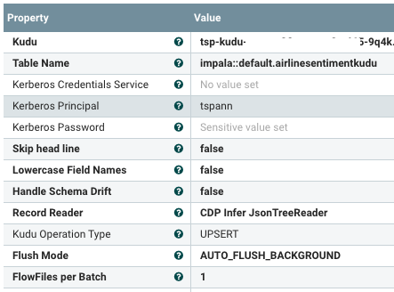 When I am writing to our Real-Time Data Mart (Apache Kudu), I enter my Kudu servers that I copied from the Kudu Data Mart Hardware page, put in my table name and your login info. I recommend UPSERT and use your Record Reader JSON.