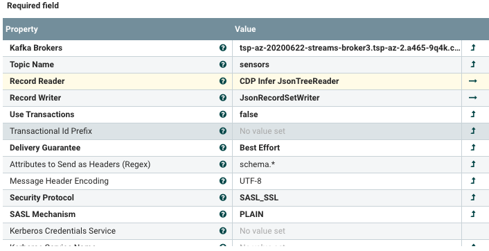 To become a Kafka Producer you set a Record Reader for the type coming in, this is JSON in my case and then set a Record Writer for the type to send to the sensors topic. In this case we kept it as JSON, but we could convert to AVRO. I usually do that if I am going to be reading it with Cloudera Kafka Connect.