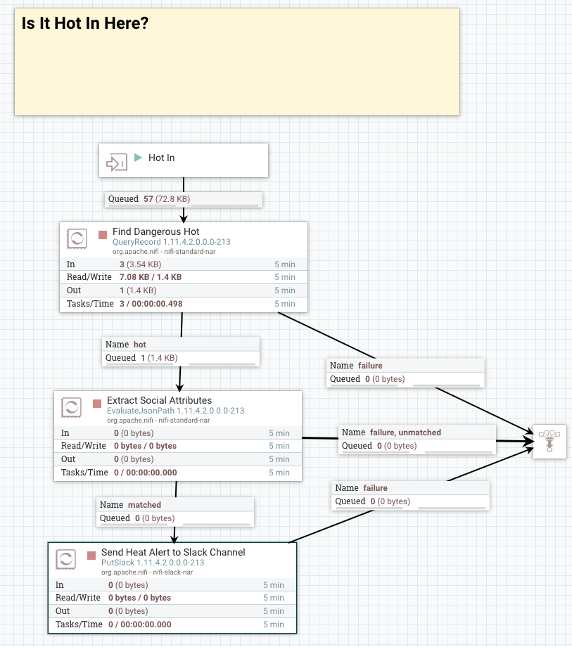 In the above process group we are using QueryRecord to segment JSON records and only pick ones where the Temperature in Fahrenheit is over 80 degrees then we pick out a few attributes to display from the record and send them to a slack channel.