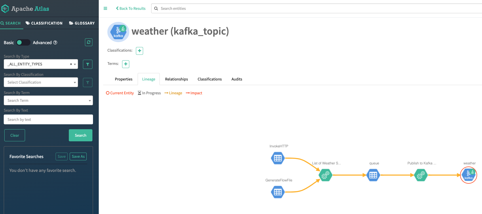 NiFi and Kafka are autoconfigured to work with Apache Atlas under our environments Data Lake SDX. We can browse through the lineage for all the Kafka topics we use.