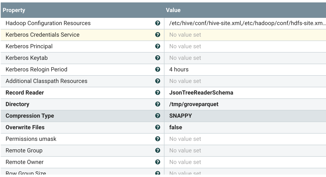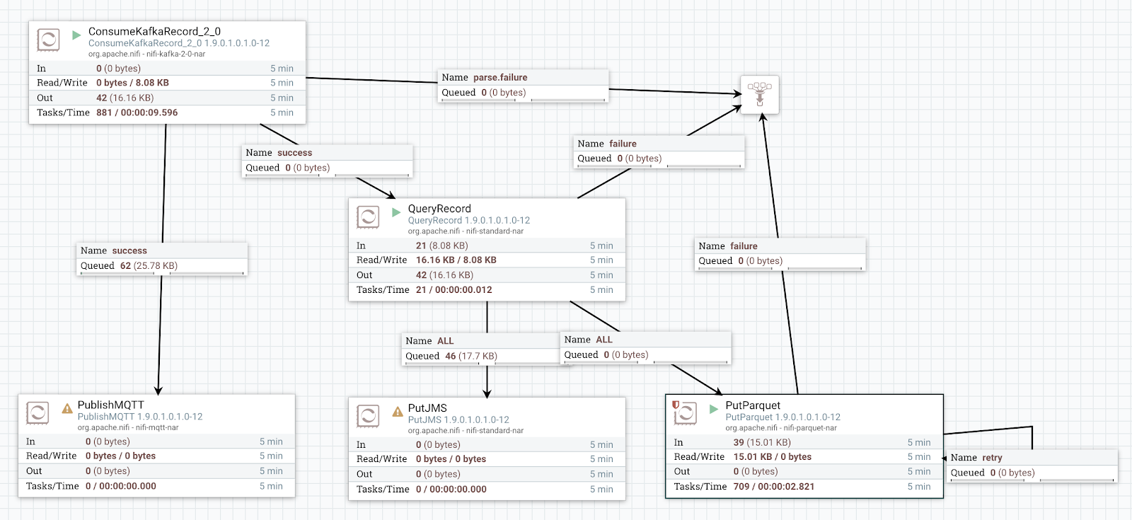 Let's store the data in Parquet files on HDFS with an Impala table. In Apache NiFi 1.10 there is a ParquetWriter.