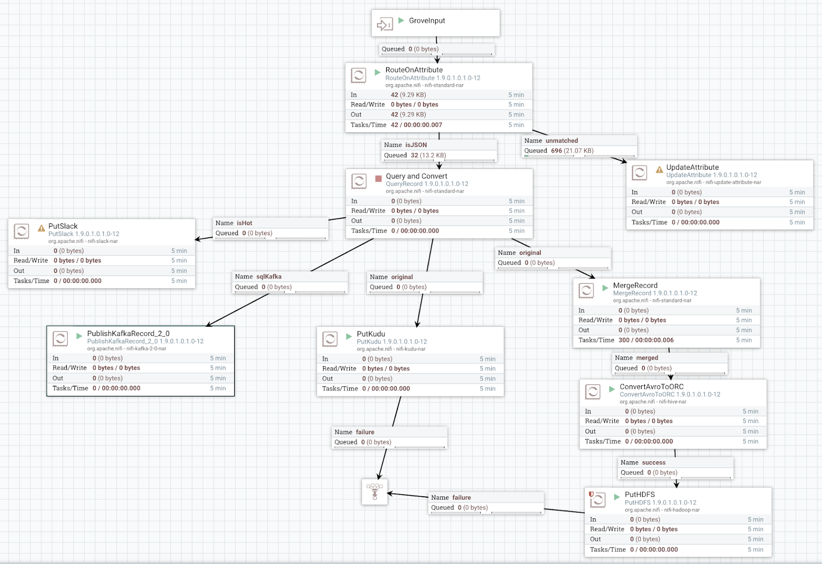 A simple flow to query and convert our JSON data, then store it to Kudu and HDFS (ORC) as well as push it to Kafka with a schema.