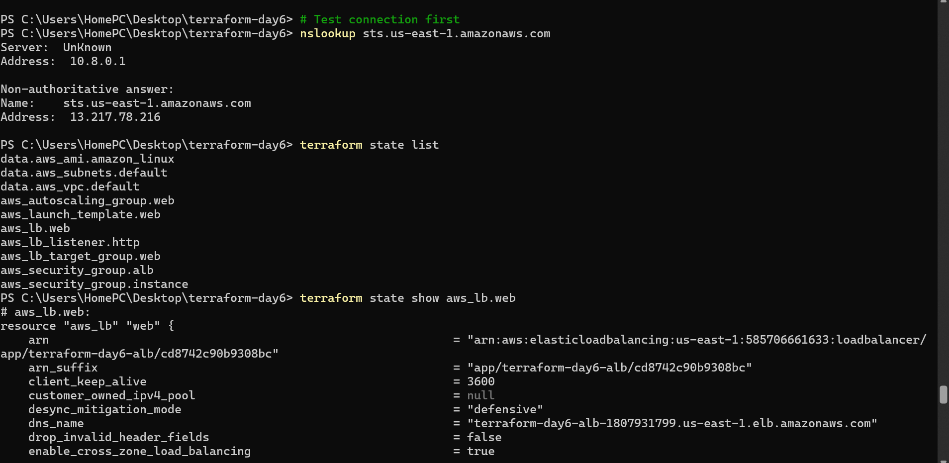 After applying my Day 6 infrastructure, I ran terraform state show aws_lb.web and was surprised by how much detail was recorded. Every attribute AWS returns for the load balancer is stored — not just the ones I configured. Fields like desync_mitigation_mode, idle_timeout, preserve_host_header, and xff_header_processing were all there, even though I never set them in my config.