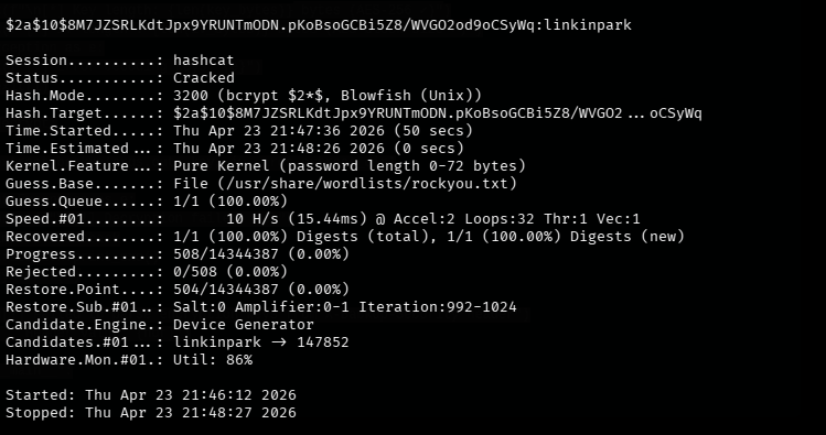 hashcat -m 3200 hash.txt /usr/share/wordlists/rockyou.txt