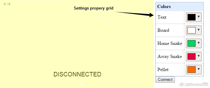 Clicking the Connect button will create a new instance of SnakeEngine, passing it the canvas, a Connector object, and the settings from the property grid: