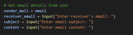 Once we have successfully logged in, we ask the user for the receiver's email ID, mail's subject, and mail body.