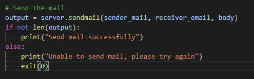 After that, we ask the user to enter the credentials for their mail account, which will be used to send the mail. We use getpass to ask the user for the password. Since we are using getpass, the password that the user will enter will not be displayed on the screen but will be saved within the variable.
