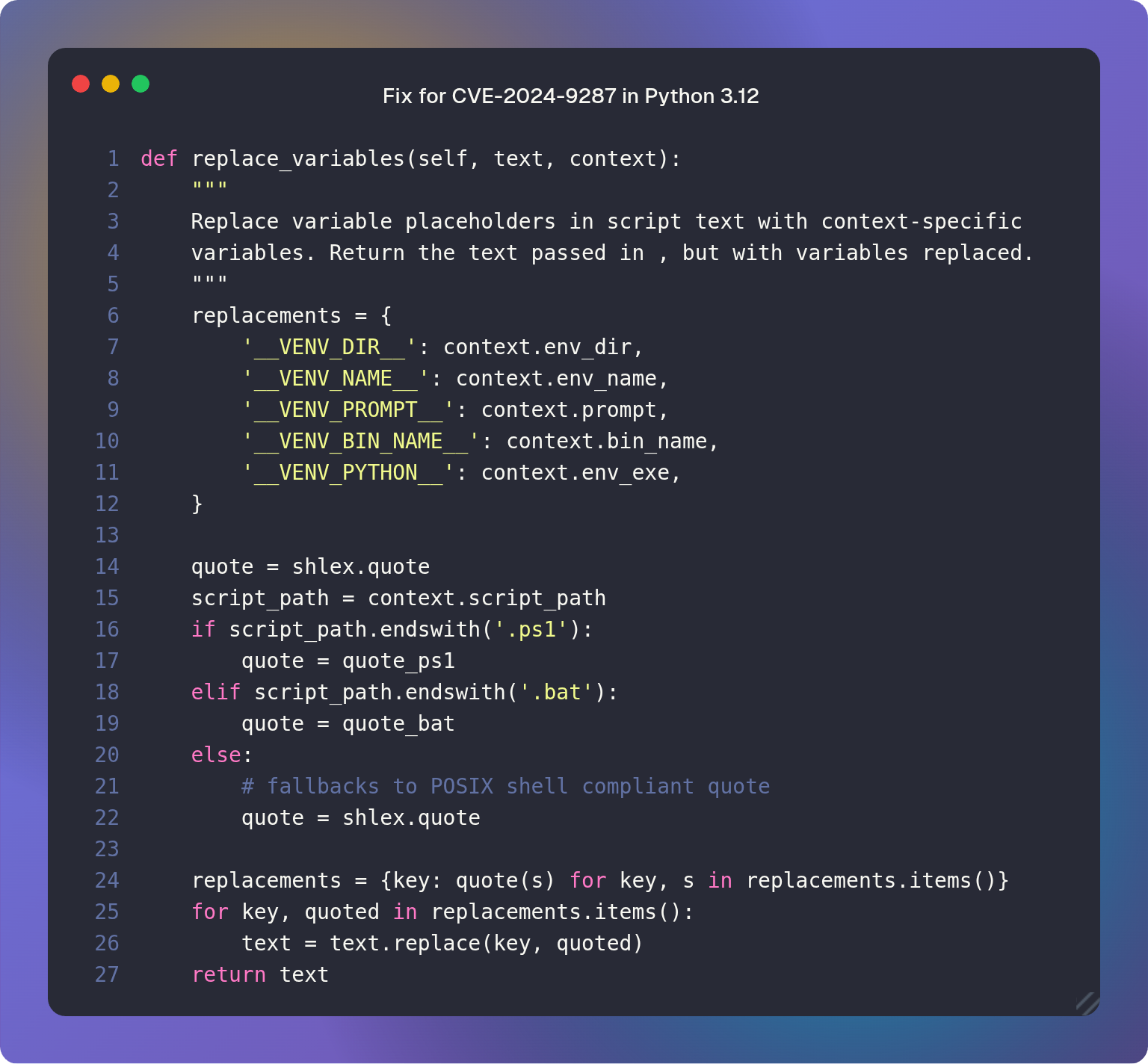 Because the issue affected all versions of Python, a patch was created for all 3.x versions. The commit diff for Python 3.12 can be found here.