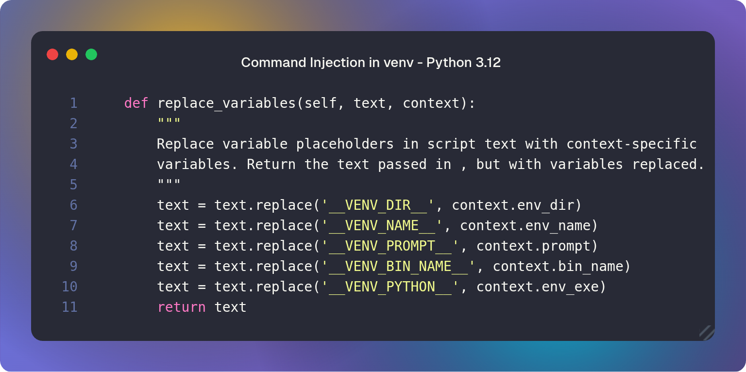 module and CLI where path names provided when creating a virtual environment were not quoted properly, allowing the creator to inject commands into virtual environment "activation" scripts (ie "source venv/bin/activate"). This means that attacker-controlled virtual environments are able to run commands when the virtual environment is activated. Virtual environments which are not created by an attacker or which aren't activated before being used (ie "./venv/bin/python") are not affected.