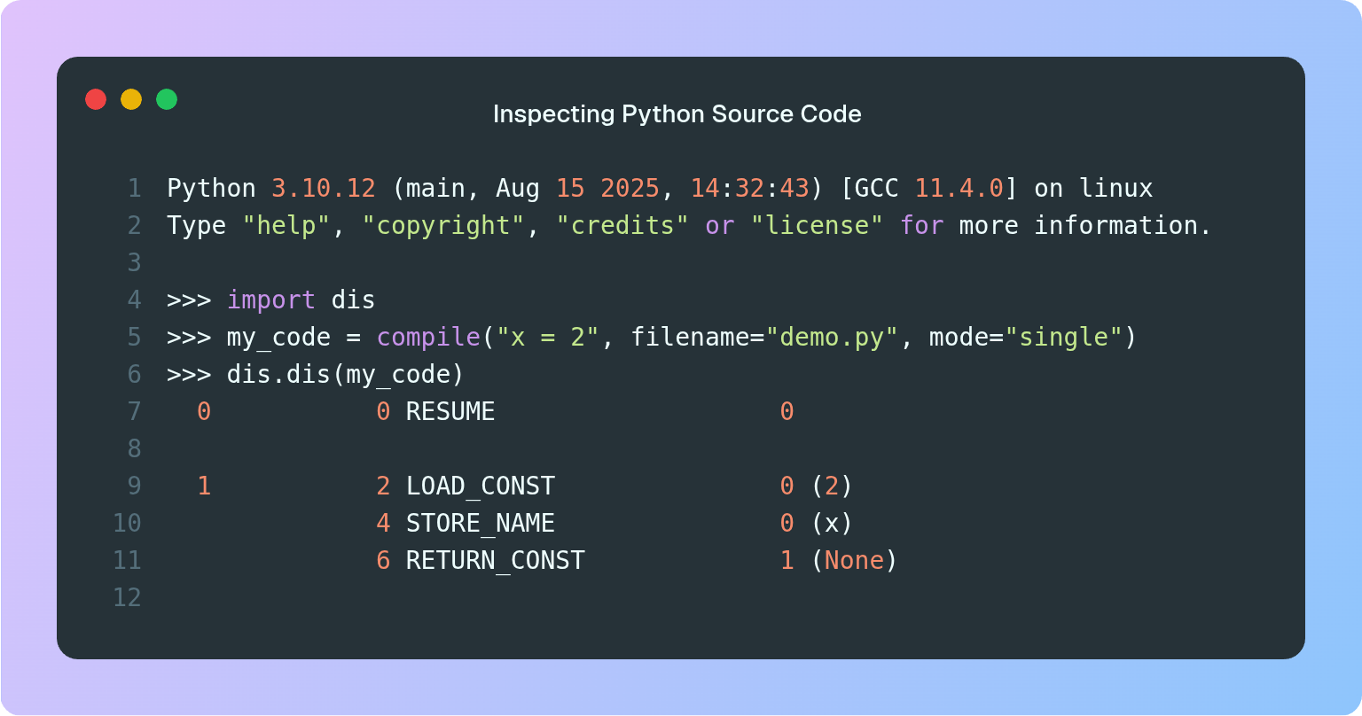 Inspecting the bytecode can inform us about how the program is run by the interpreter. However, the bytecode is stored in an efficient binary format that is not human readable.