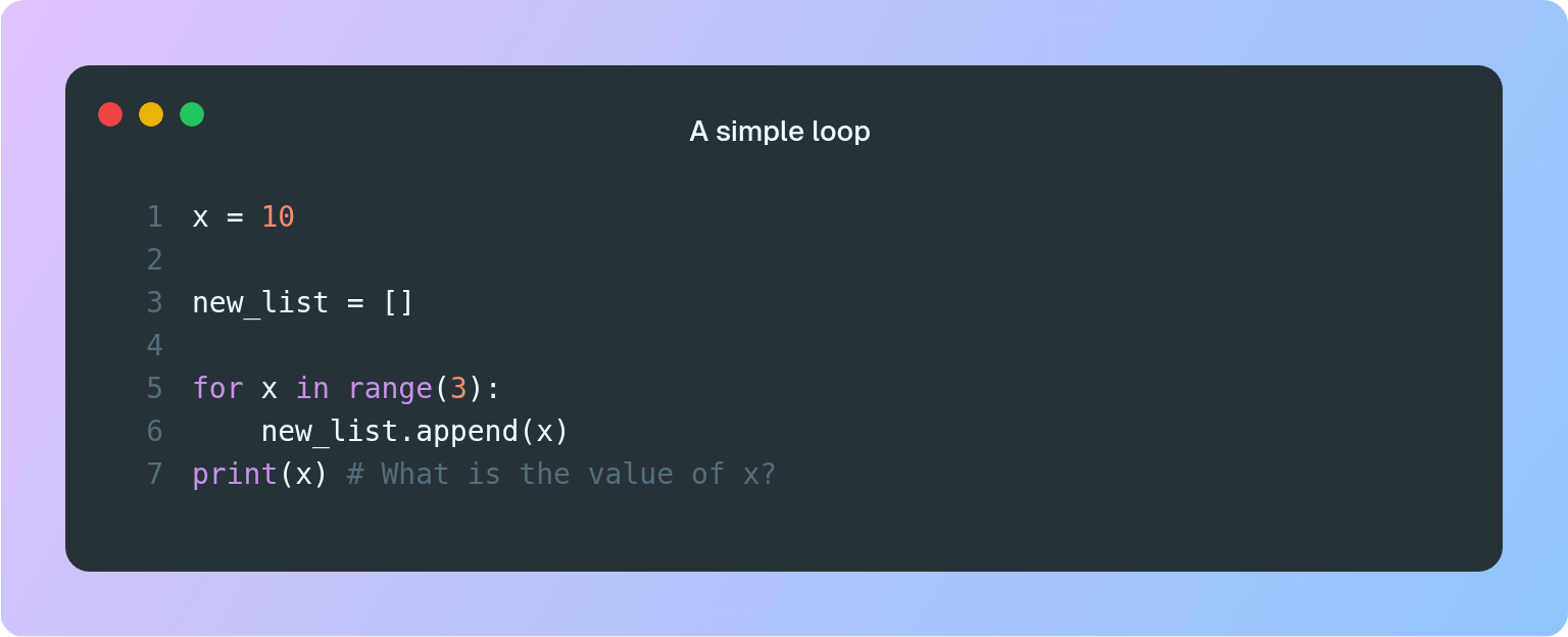In Koan 4 we learnt that Python has 4 scopes (Local, Enclosing, Global and Builtin). However, there is also another “hidden” scope. Consider this loop: