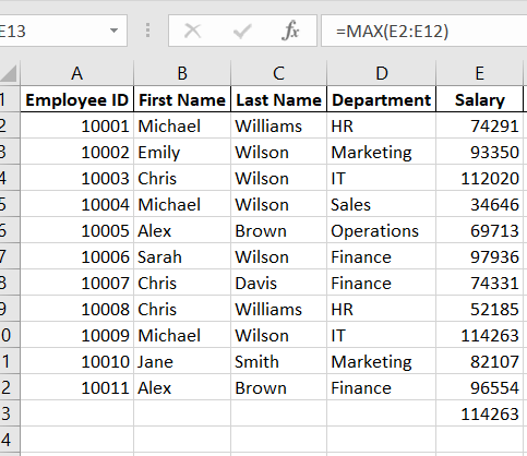 =MAX(E2:E12) Highest salary