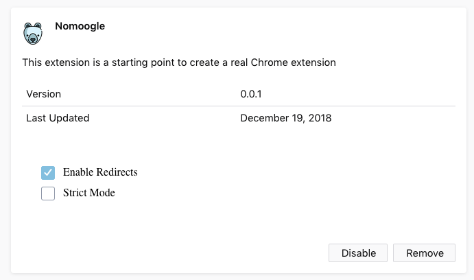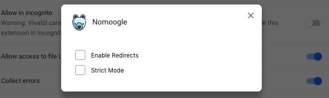 - Nomoogle also lets you browse the web in two special modes: Redirect Mode and Strict Mode. In Redirect Mode, you are just redirected to an alternative whenever you try to access a Google website, e.g. DuckDuckGo for search when you try to open Google Search. In Strict Mode, you will simply be blocked from accessing Google websites. Enable this for a hardcore Google fast.