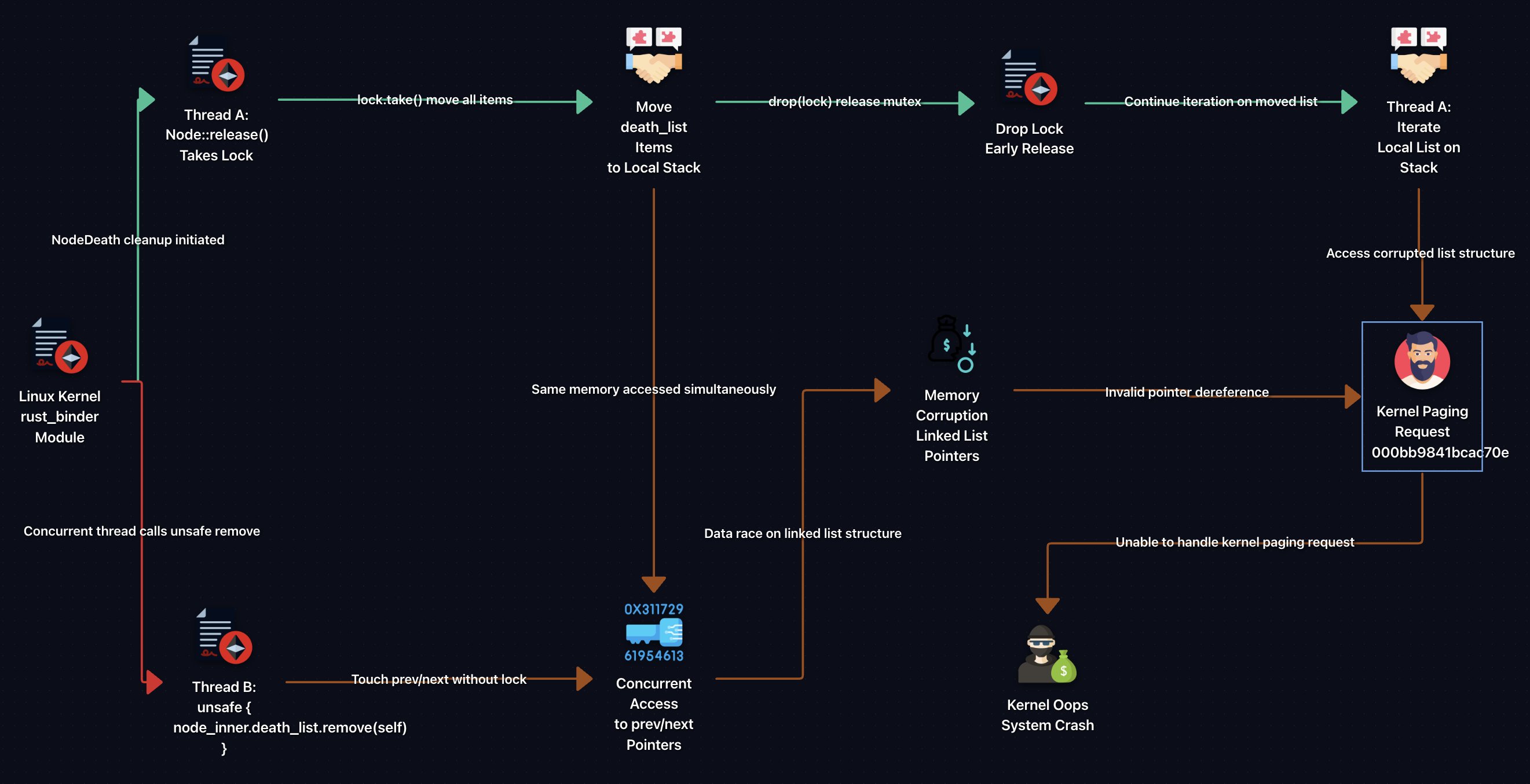 This is a classic Data Race, corrupting the linked list pointers. The end result is a kernel crash: